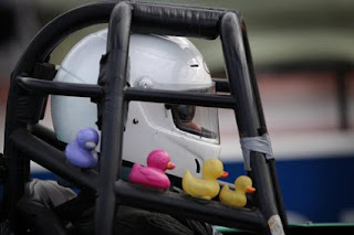 "Some say... he won't drive a race without a guardian rubber duck on hand. All we know is, he's called The Stig!"